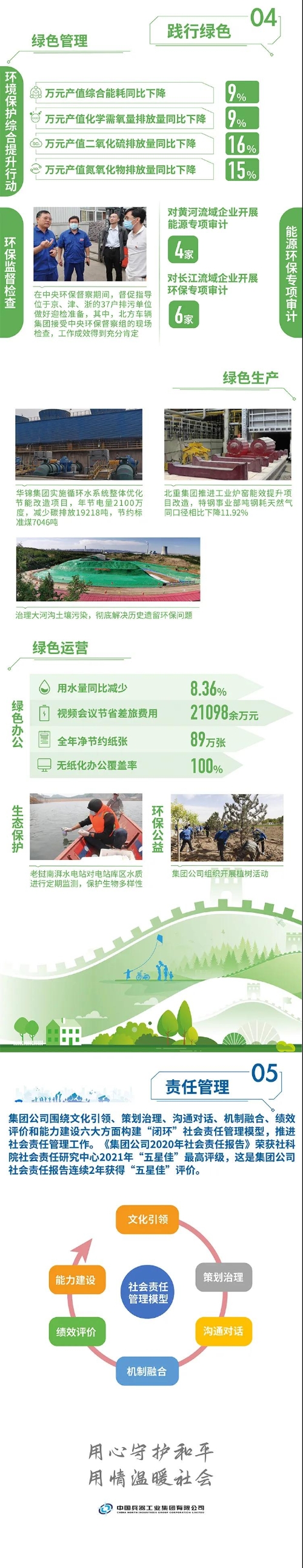 近日,國務(wù)院國資委在京舉辦“責(zé)任創(chuàng)造價(jià)值,責(zé)任引領(lǐng)未來——中央企業(yè)社會責(zé)任報(bào)告集中發(fā)布活動(dòng)(2021)”,來自中央企業(yè)的92份《報(bào)告》向公眾全面展示央企認(rèn)真履行社會責(zé)任的成果。兵器工業(yè)集團(tuán)參加集中發(fā)布活動(dòng),并向社會公眾正式發(fā)布第十二份年度社會責(zé)任報(bào)告——《中國兵器工業(yè)集團(tuán)有限公司2020年社會責(zé)任報(bào)告》,全面披露2020年度集團(tuán)公司履責(zé)實(shí)踐和履責(zé)成效。會上發(fā)布了《中央企業(yè)社會責(zé)任藍(lán)皮書(2021)》,《中國兵器工業(yè)集團(tuán)有限公司:內(nèi)化于心外化于行,打造央企責(zé)任管理表率》成功入選典型案例。 2020年,是“十三五”規(guī)劃收官之年,也是全面建成小康社會、實(shí)現(xiàn)第一個(gè)百年目標(biāo)的決勝之年。集團(tuán)公司黨組書記、董事長焦開河在報(bào)告開篇指出,集團(tuán)公司實(shí)現(xiàn)了“十三五”圓滿收官,整體步入了高質(zhì)量發(fā)展軌道,呈現(xiàn)出基礎(chǔ)更牢、動(dòng)力更強(qiáng)、空間更大、效能更高的積極向上良好態(tài)勢。在“十三五”特別是近三年來的工作實(shí)踐中,我們明確了“集團(tuán)公司是國家安全和國防建設(shè)的脊梁、是國家戰(zhàn)略科技力量最為重要的組成部分、是黨和國家最可信賴的‘六個(gè)力量’,肩負(fù)著支撐國防軍隊(duì)建設(shè)、推動(dòng)科技自立自強(qiáng)、服務(wù)構(gòu)建新發(fā)展格局的重大政治責(zé)任和光榮使命,具有極強(qiáng)的政治屬性,性質(zhì)特殊、使命特殊、責(zé)任特殊”的新時(shí)代新階段職責(zé)使命,深化了對“堅(jiān)持以習(xí)近平新時(shí)代中國特色社會主義思想定向領(lǐng)航,是集團(tuán)公司高質(zhì)量發(fā)展的根本遵循;保持貫徹落實(shí)習(xí)近平總書記重要指示批示和黨中央決策部署的戰(zhàn)略定力,是集團(tuán)公司高質(zhì)量發(fā)展的根本前提;履行好強(qiáng)軍這個(gè)首要職責(zé),是集團(tuán)公司高質(zhì)量發(fā)展的根本要求;加快兵器科技創(chuàng)新突破,是集團(tuán)公司高質(zhì)量發(fā)展的根本支撐;加強(qiáng)黨的領(lǐng)導(dǎo)黨的建設(shè),是集團(tuán)公司高質(zhì)量發(fā)展的根本保證”的兵器工業(yè)改革發(fā)展規(guī)律認(rèn)識。 《報(bào)告》聚焦“抗疫斗爭中的‘兵器力量’”,生動(dòng)展示了集團(tuán)公司抗擊疫情的有力行動(dòng),展現(xiàn)了集中力量辦大事、急國家之所急的“兵器速度”,彰顯了“把一切獻(xiàn)給黨”的人民兵工精神和貫徹落實(shí)國家決策部署的責(zé)任擔(dān)當(dāng)。《報(bào)告》以“用心守候和平、用情溫暖社會”為主題,從恪守本責(zé)、共創(chuàng)價(jià)值、致力和諧、踐行綠色、責(zé)任管理五個(gè)維度,全面展現(xiàn)集團(tuán)公司在堅(jiān)持履行政治責(zé)任、經(jīng)濟(jì)責(zé)任、社會責(zé)任,履行強(qiáng)軍首責(zé)、加強(qiáng)黨的建設(shè)、打造國家戰(zhàn)略科技力量、推進(jìn)“一帶一路”倡議、打好打贏三大攻堅(jiān)戰(zhàn)、深化改革、助力員工成長、支持社會公益事業(yè)、提升社會責(zé)任管理等方面的生動(dòng)實(shí)踐和履責(zé)亮點(diǎn),凸顯集團(tuán)公司保持貫徹落實(shí)黨中央決策部署的戰(zhàn)略定力、在聚焦主責(zé)主業(yè)、科技引領(lǐng)、國際化經(jīng)營上持續(xù)用力,為實(shí)現(xiàn)第一個(gè)百年奮斗目標(biāo)貢獻(xiàn)力量的初心與行動(dòng)。《報(bào)告》再次獲得中國企業(yè)社會責(zé)任報(bào)告評級專家委員會“五星佳”最高評級,兵器工業(yè)集團(tuán)成為軍工行業(yè)唯一連續(xù)10年獲得最高評級的企業(yè)。 2021年是開啟新征程的開局之年,也是建黨100周年、人民兵工創(chuàng)建90周年,兵器工業(yè)集團(tuán)將全面貫徹落實(shí)黨中央戰(zhàn)略部署,緊扣推動(dòng)高質(zhì)量發(fā)展主題,圍繞“十四五”開好局、起好步,堅(jiān)決完成黨中央賦予的職責(zé)使命,履行好中央企業(yè)和軍工集團(tuán)的政治責(zé)任、經(jīng)濟(jì)責(zé)任、社會責(zé)任,為實(shí)現(xiàn)中國夢強(qiáng)軍夢作出新的更大貢獻(xiàn)! 一圖看懂《中國兵器工業(yè)集團(tuán)有限公司2020年社會責(zé)任報(bào)告》 |